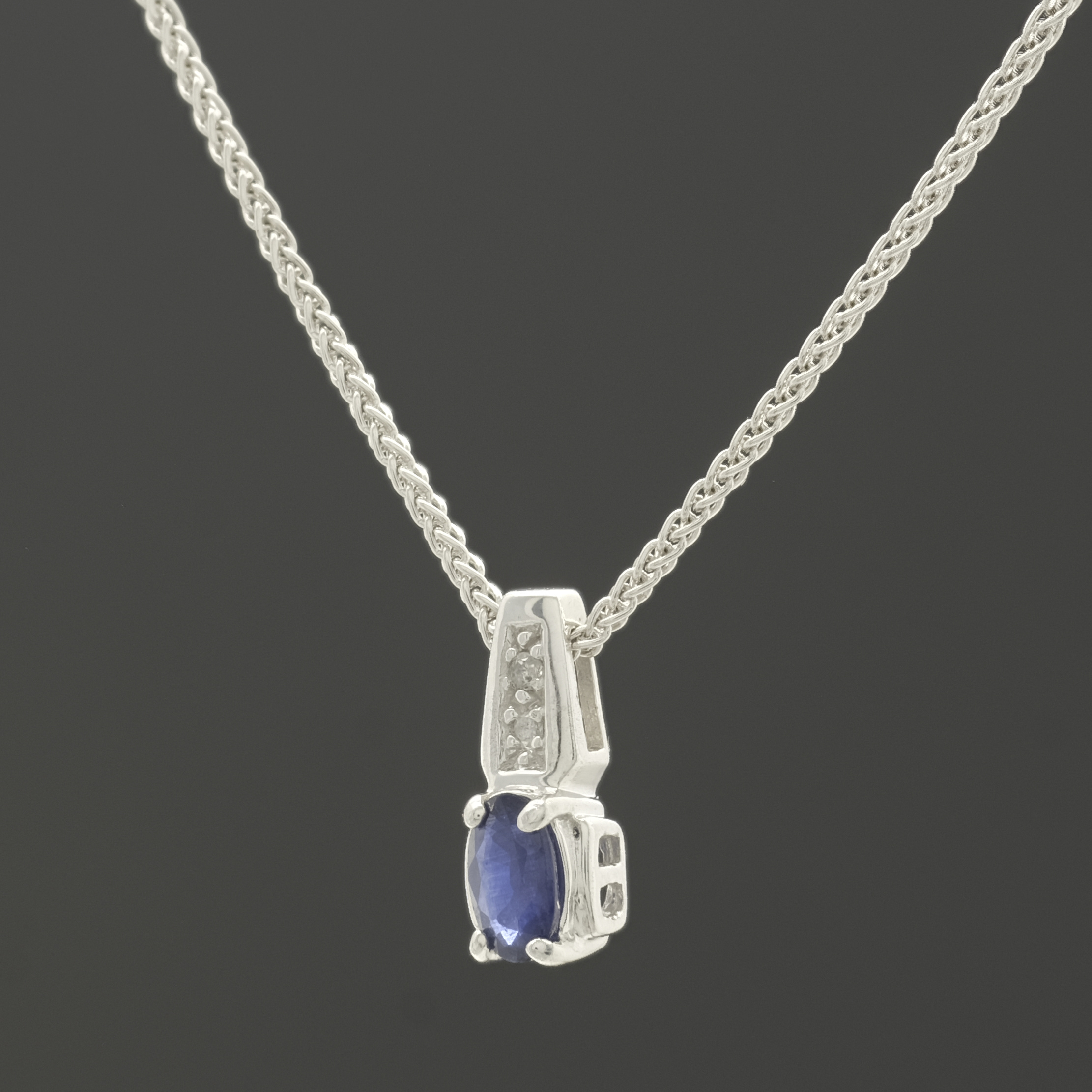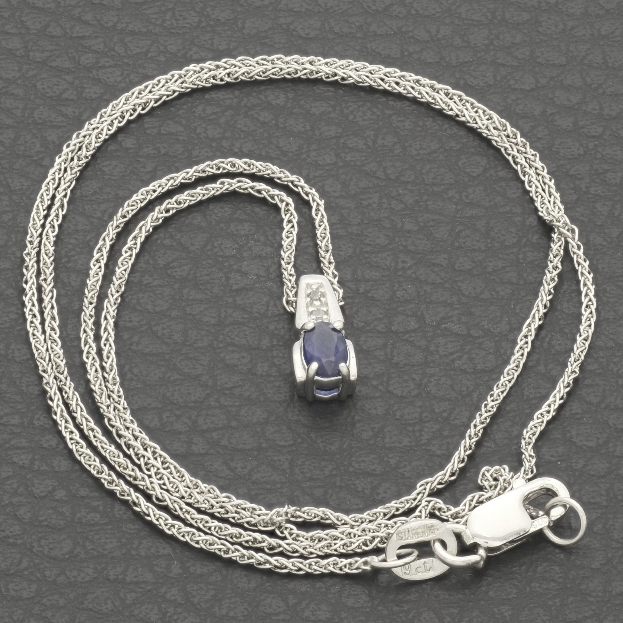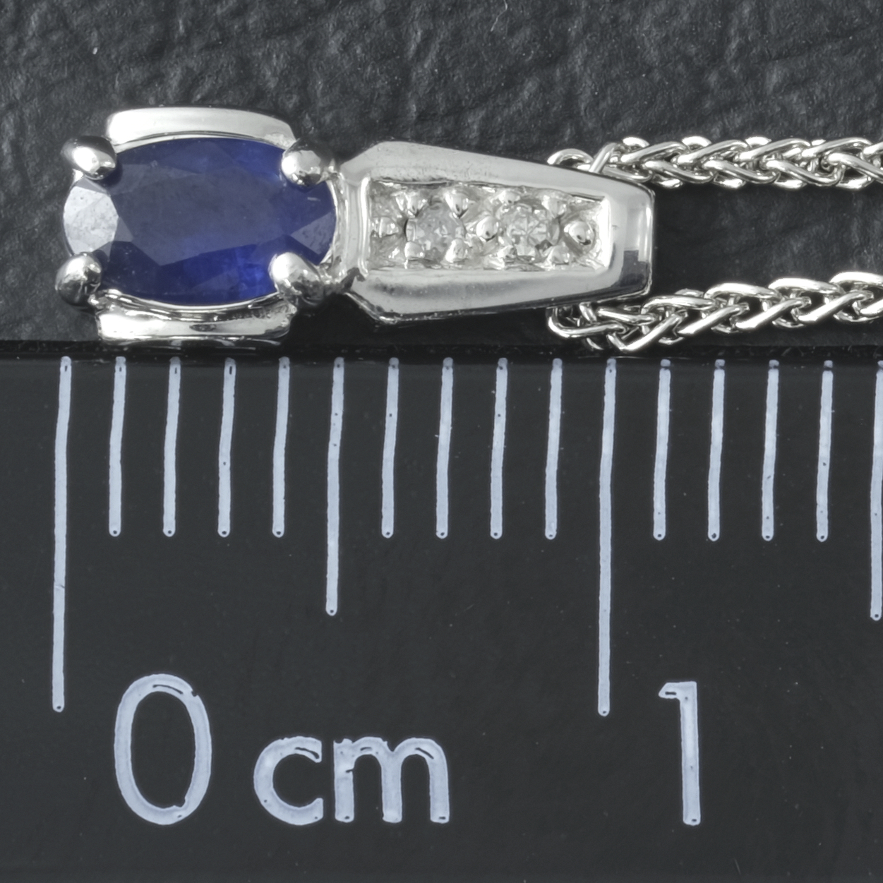 This elegant ladies pre-owned 9ct white gold necklace features a stunning sapphire and diamond dropper pendant. The deep blue sapphire is beautifully complemented by sparkling diamonds, creating a timeless and sophisticated design. Perfect for adding a touch of glamour to any outfit, this necklace is a true classic. The sapphire weight is 0.20ct and diamond weight 0.01ct, on a 18” pendant chain.