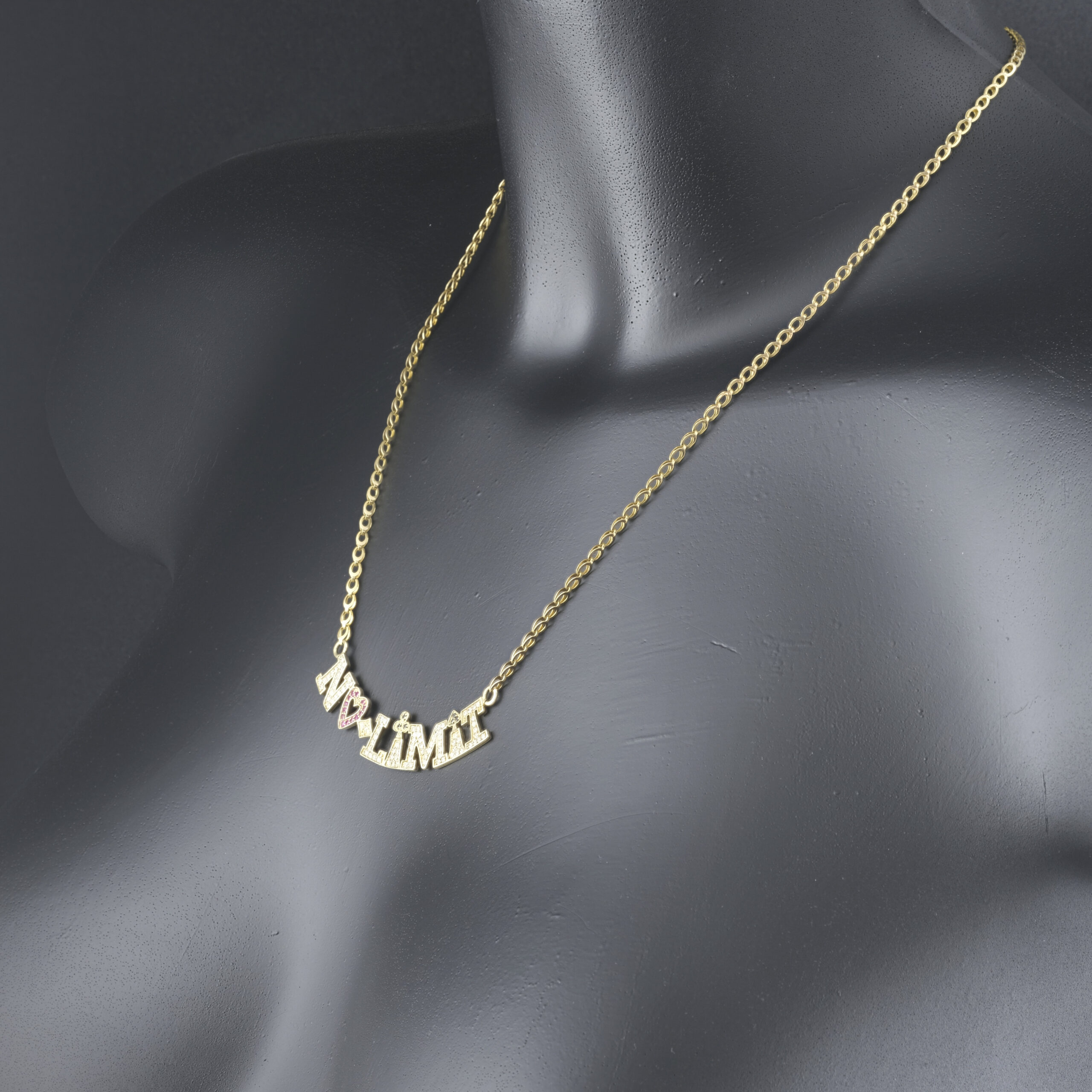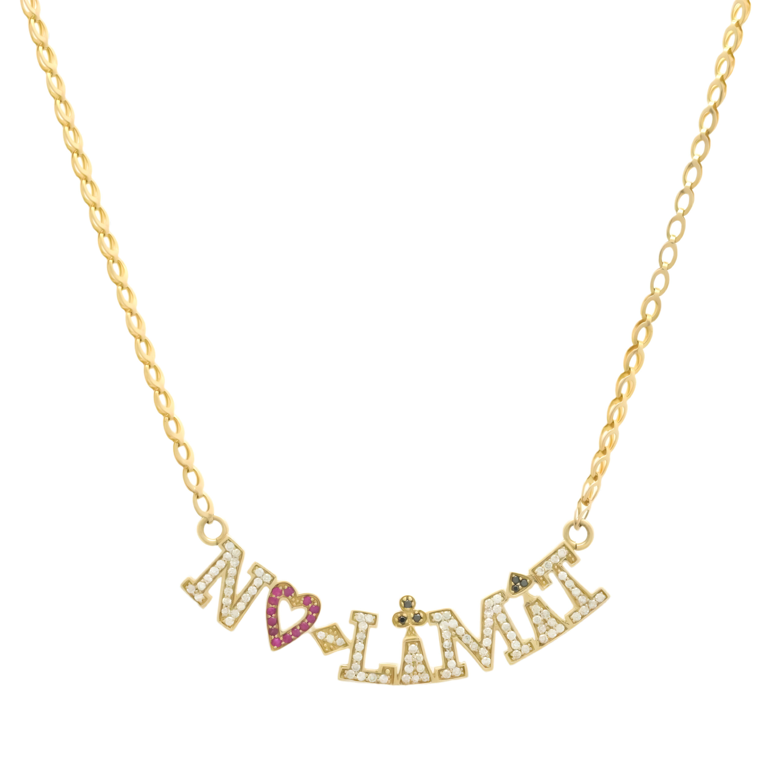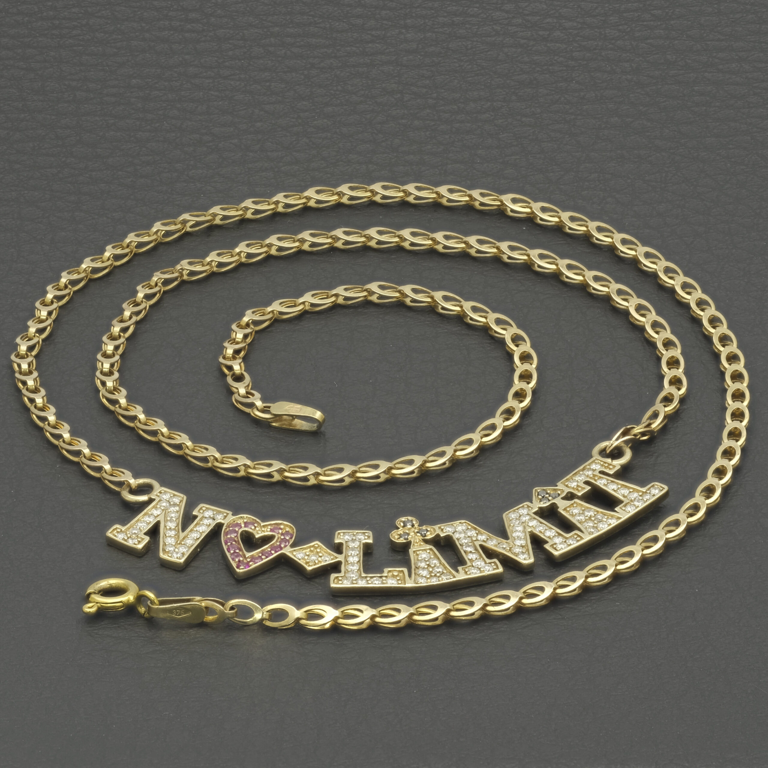 A beautiful pre-owned 9ct yellow gold diamond and ruby necklace. The necklace features the words “No Limit” fitted with diamonds and rubies. This pendant hangs from an 18-inch 9ct yellow gold chain and fastens with a spring ring clasp. This necklace is perfect for any occasion and is sure to catch the eye.