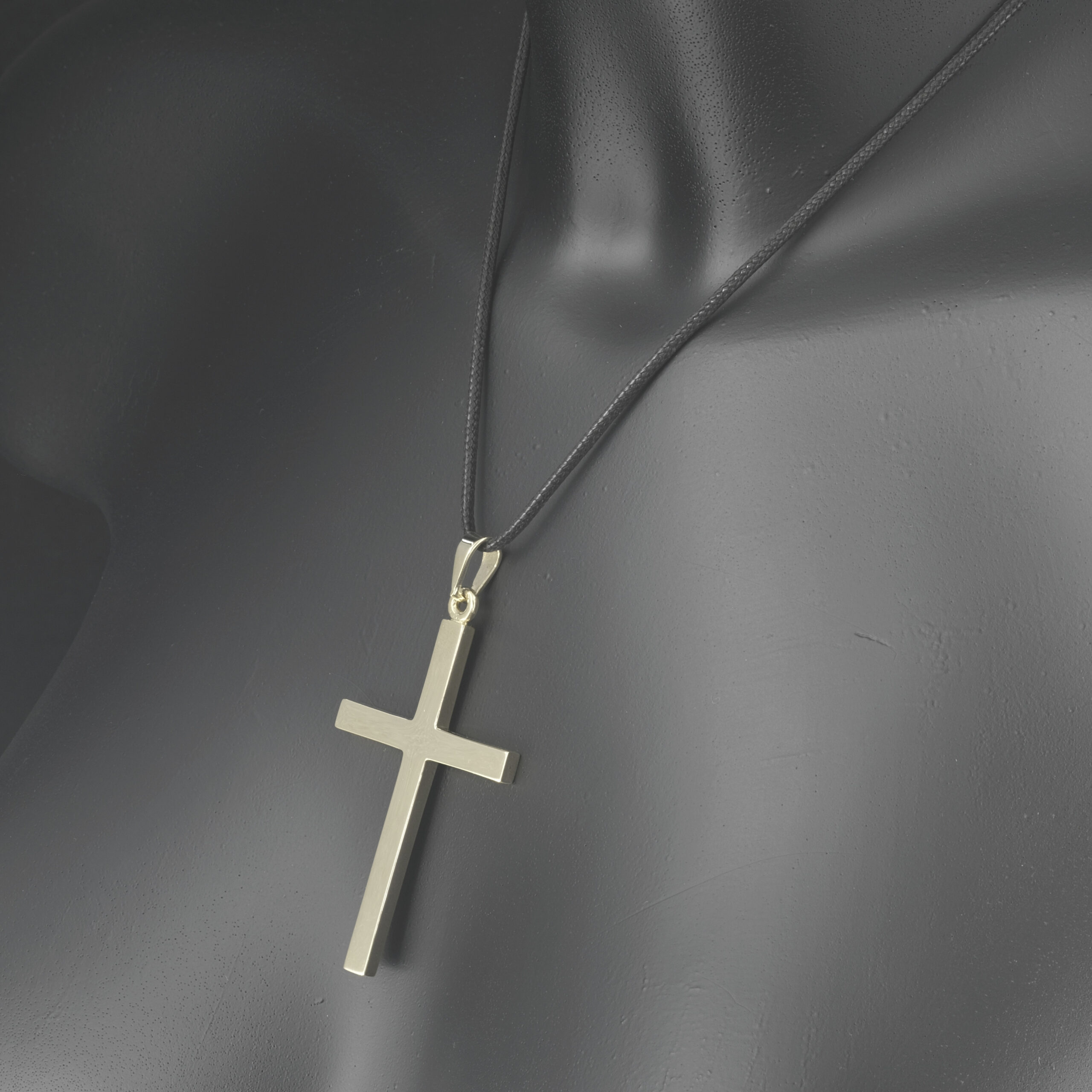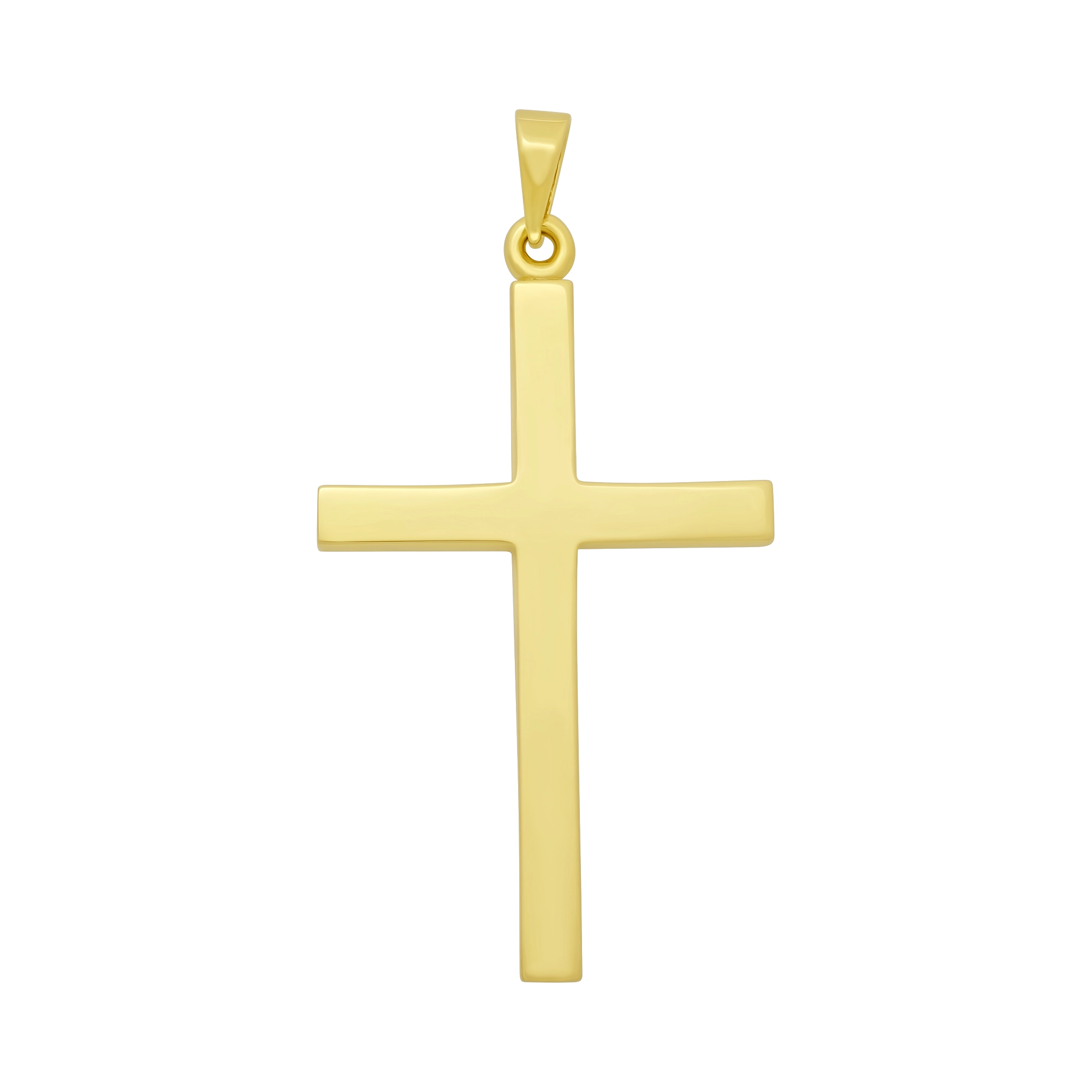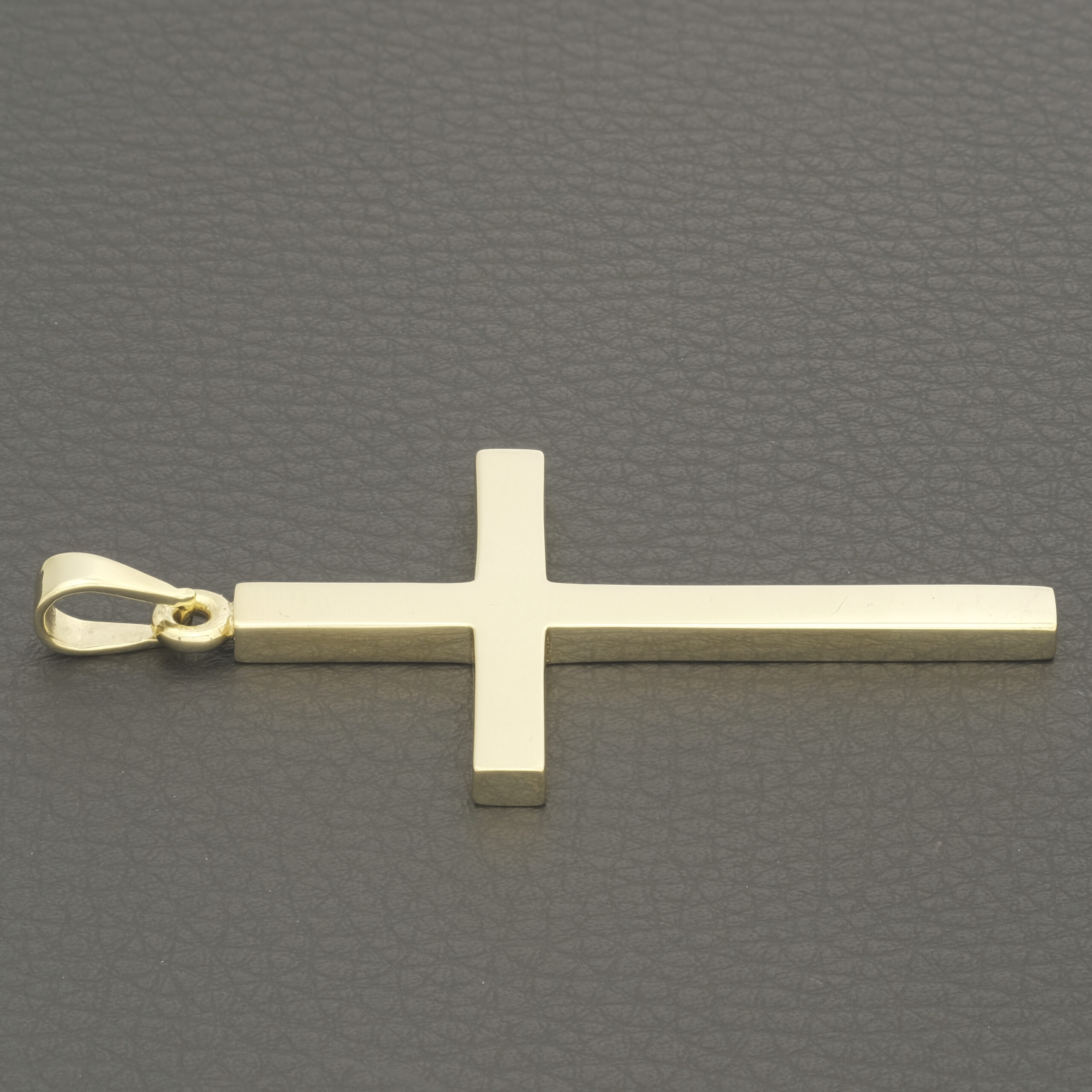A pre-owned, 9ct yellow gold solid cross pendant. The stylish pendant measures 71.5mm in height from the top of the bail to the bottom and 37mm in width. This pendant is best suited for a chain of medium-large thickness.