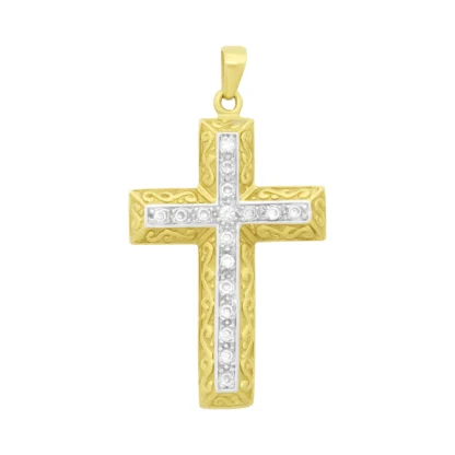 A pre-owned, 9ct yellow gold cross pendant featuring white gemstones. The stylish pendant measures 51mm in height from the top of the bail to the bottom and 28mm in width. This pendant is best suited for a chain of small-medium thickness.