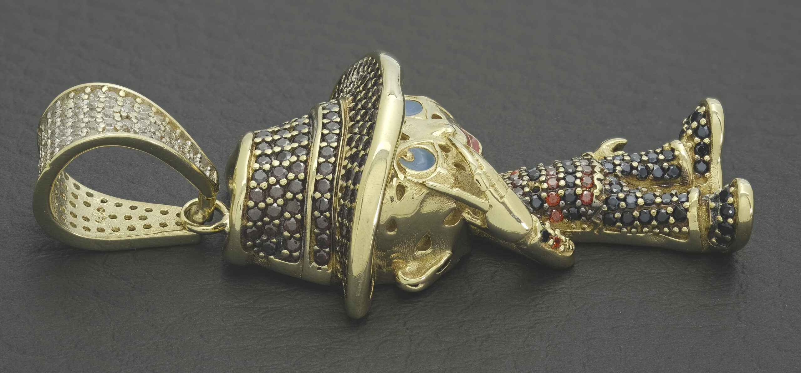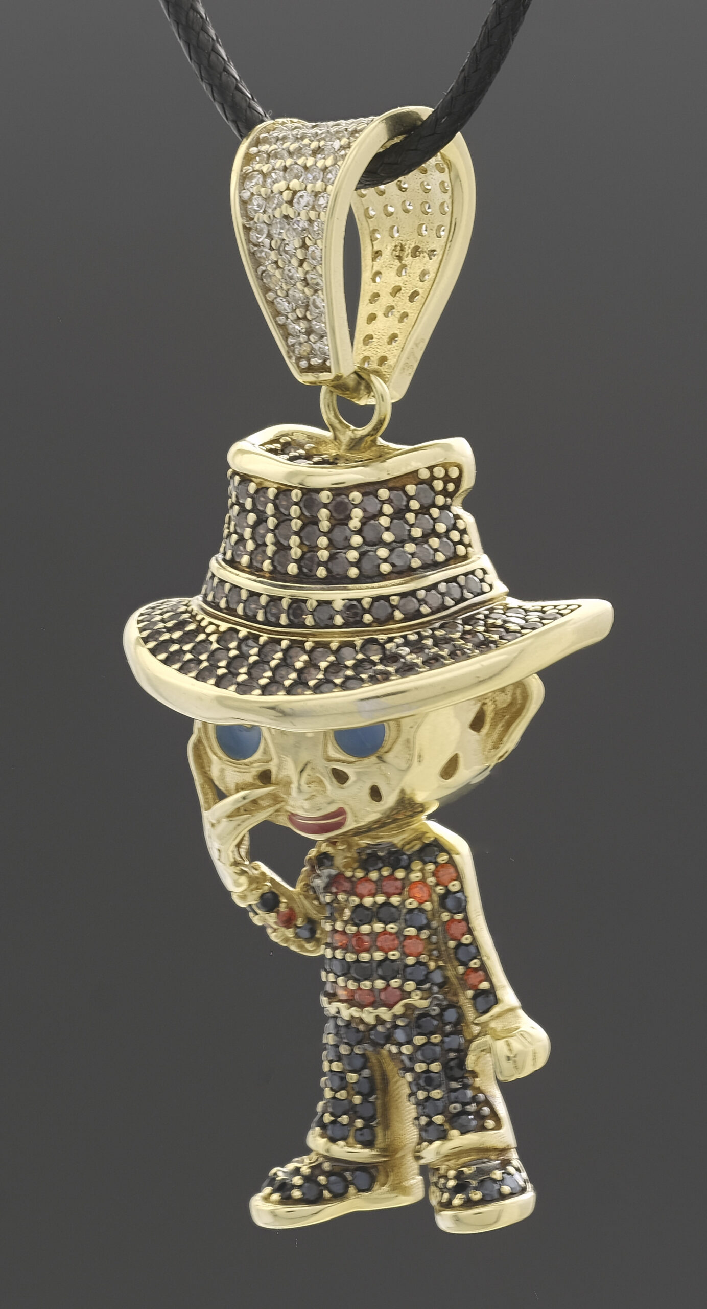 A pre-owned, 9ct yellow gold gemstone Freddie Krueger pendant that is guaranteed to catch the eye. This pendant measures 26mm in width and 55mm in height from the top of the bail to the bottom.