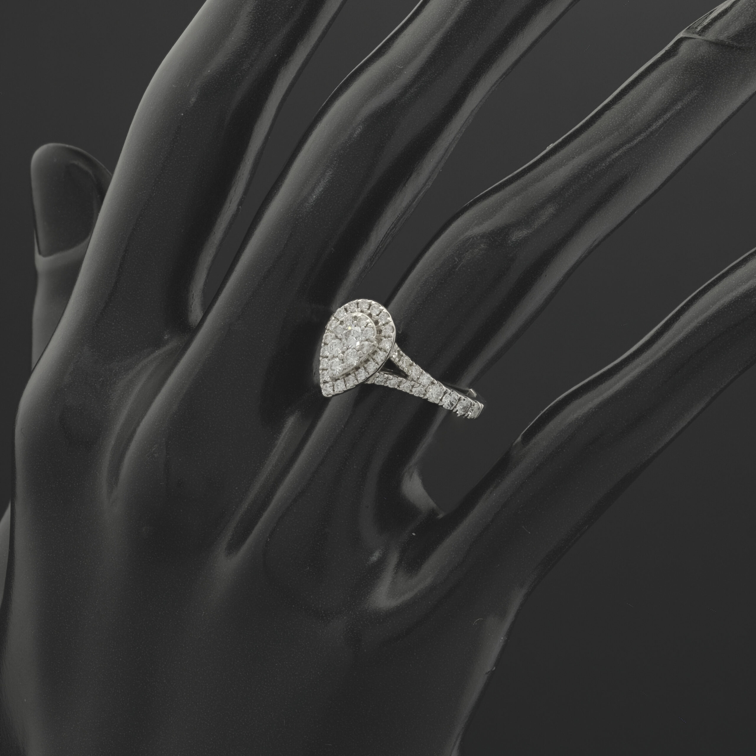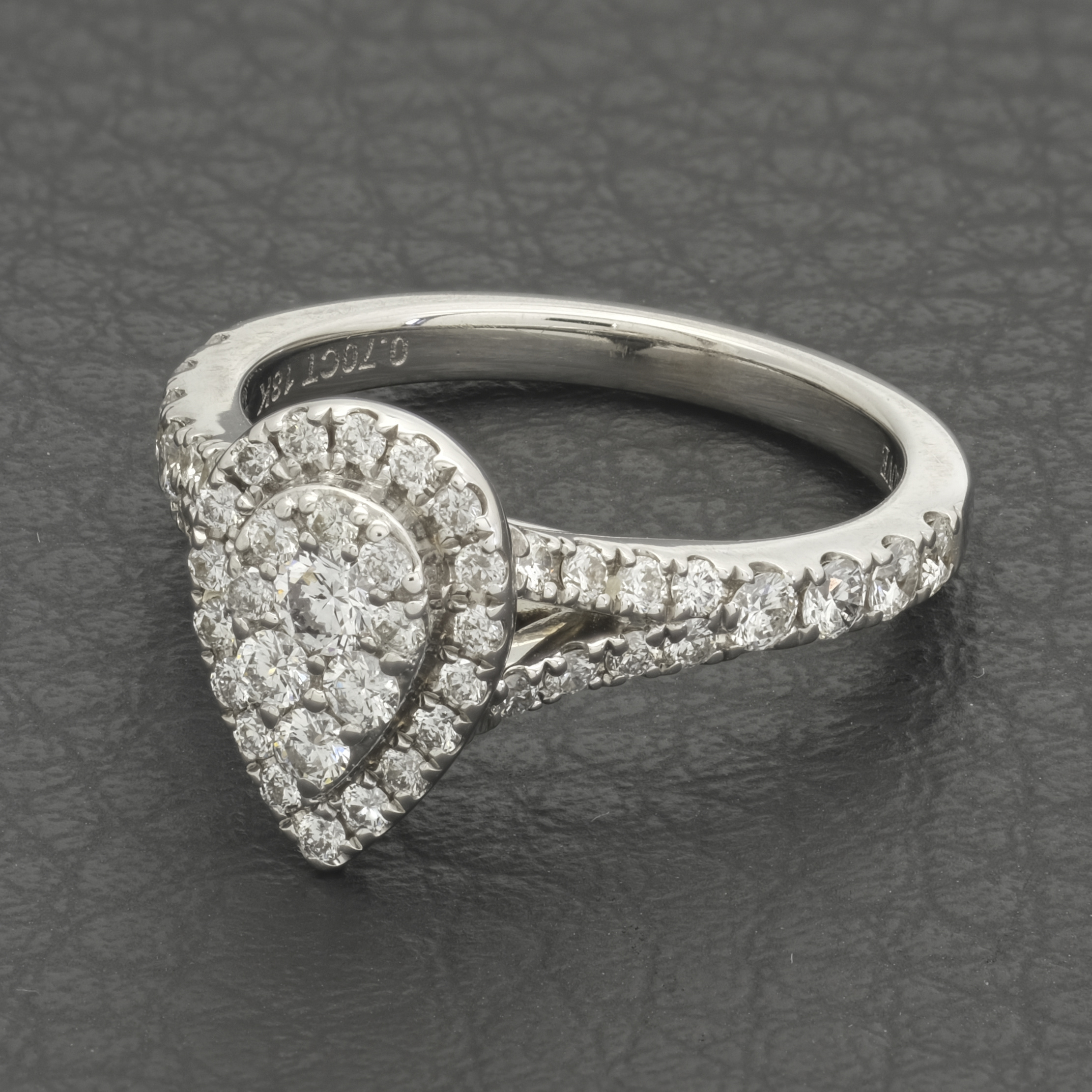 Indulge in the elegance of this pre-owned 18ct white gold diamond pear halo ring, a true masterpiece of design and sparkle. Brilliant-cut diamonds are meticulously arranged to create a stunning pear-shaped centre piece, surrounded by a shimmering halo that enhances its brilliance. The double row of diamond-set shoulders adds even more radiance, bringing the total diamond weight to 0.70ct, with a colour of H-I and clarity Si1-Si2. For an extra special touch, a hidden princess-cut sapphire is nestled under the head, adding a unique and meaningful detail. This ring is a perfect blend of timeless sophistication and modern charm, making it a truly unforgettable piece