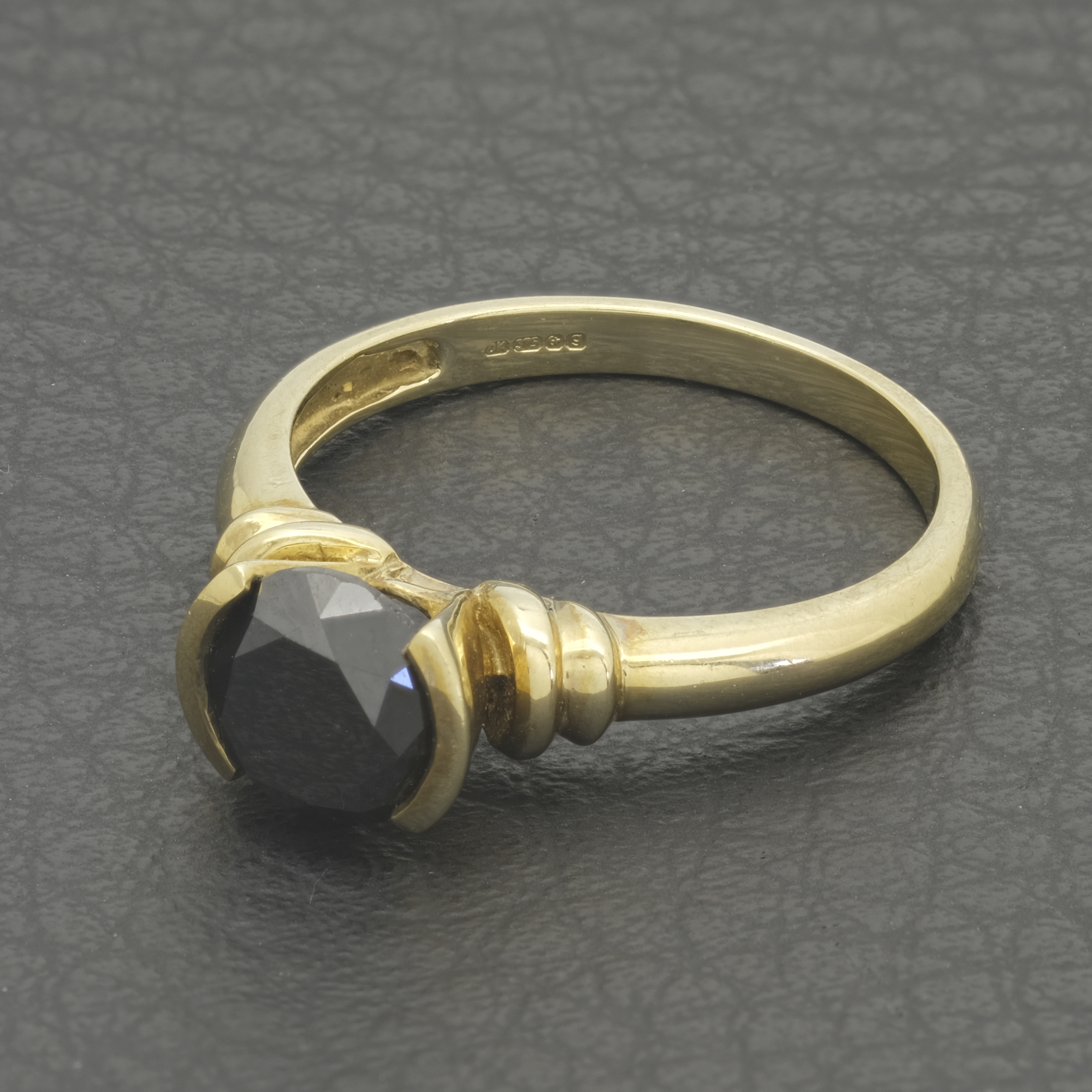 Make a bold statement with this pre-owned single-stone black diamond ring, crafted in 9ct yellow gold. Featuring a captivating 1.73ct black diamond as its centre piece, this ring exudes modern elegance and dramatic allure. The rich yellow gold setting beautifully contrasts with the deep, mysterious hue of the diamond, creating a design that is both unique and timeless. Perfect for those who love to stand out, this ring is a stunning choice for any occasion.