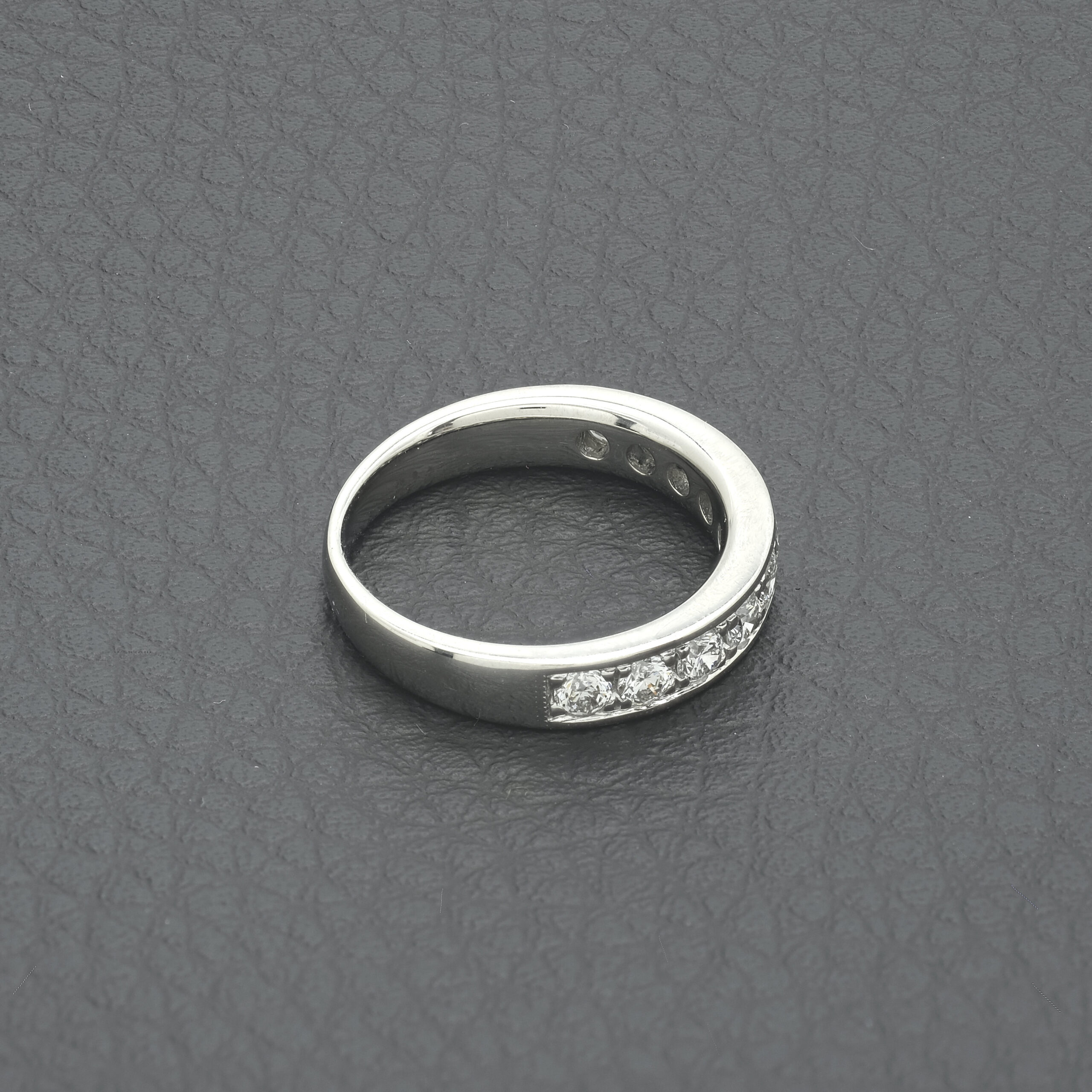 A delightful pre-owned platinum 0.75ct diamond half eternity ring. Consisting of ten round cut diamonds set in a single row. The assessing colour is G-H, and the assessing clarity is VS2-SI1. This stunning ring is sure to catch the eye.