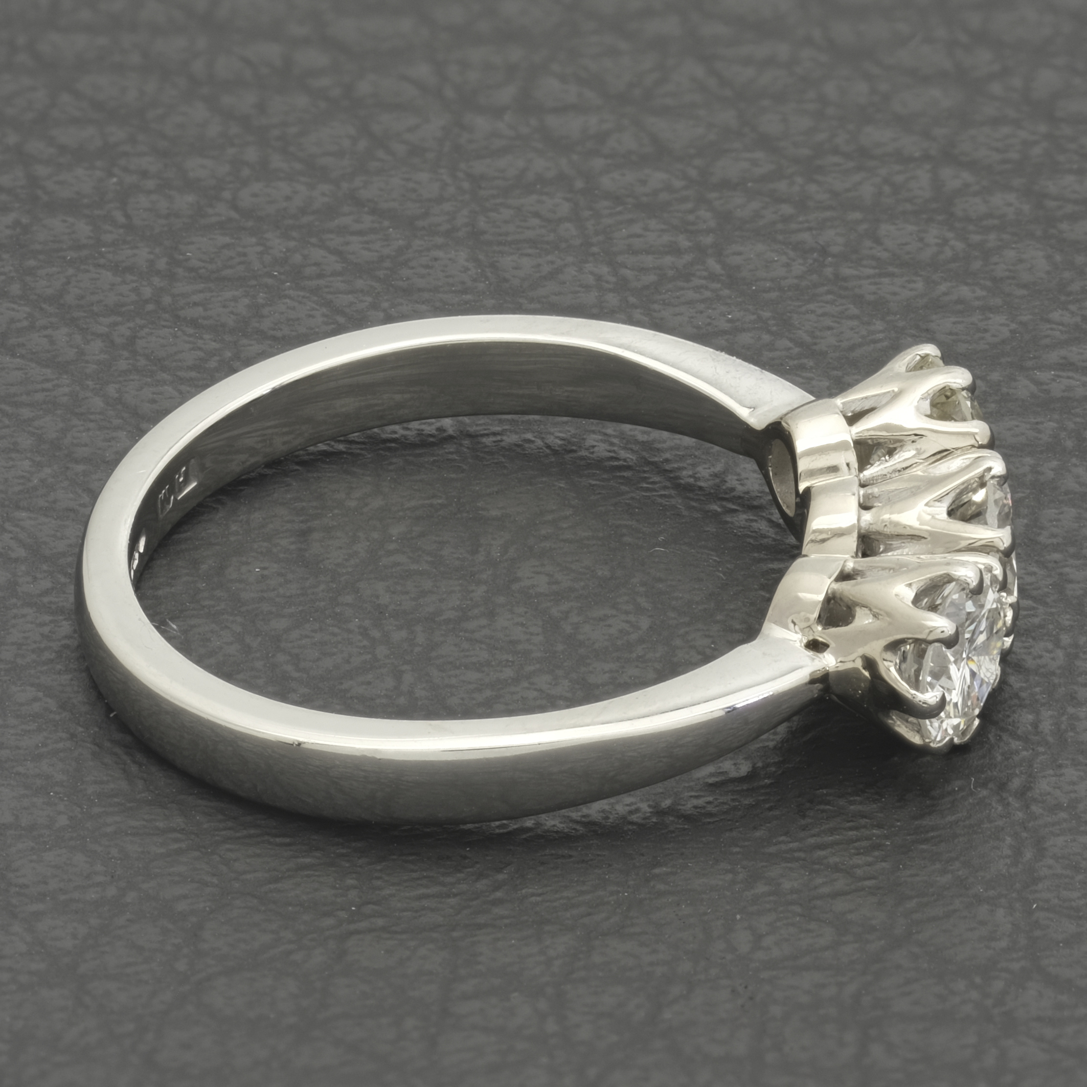 Celebrate classic elegance with this exquisite pre-owned platinum three-stone diamond ring. Featuring a trio of dazzling round brilliant-cut diamonds, this design symbolizes the past, present, and future of your love story. With a total diamond weight of 1.00ct, the diamonds boast an H-I colour and VS1-VS2 clarity, ensuring exceptional sparkle and brilliance. Set in luxurious platinum, this ring is a timeless piece that exudes sophistication and meaning, perfect for marking life’s most cherished moments.