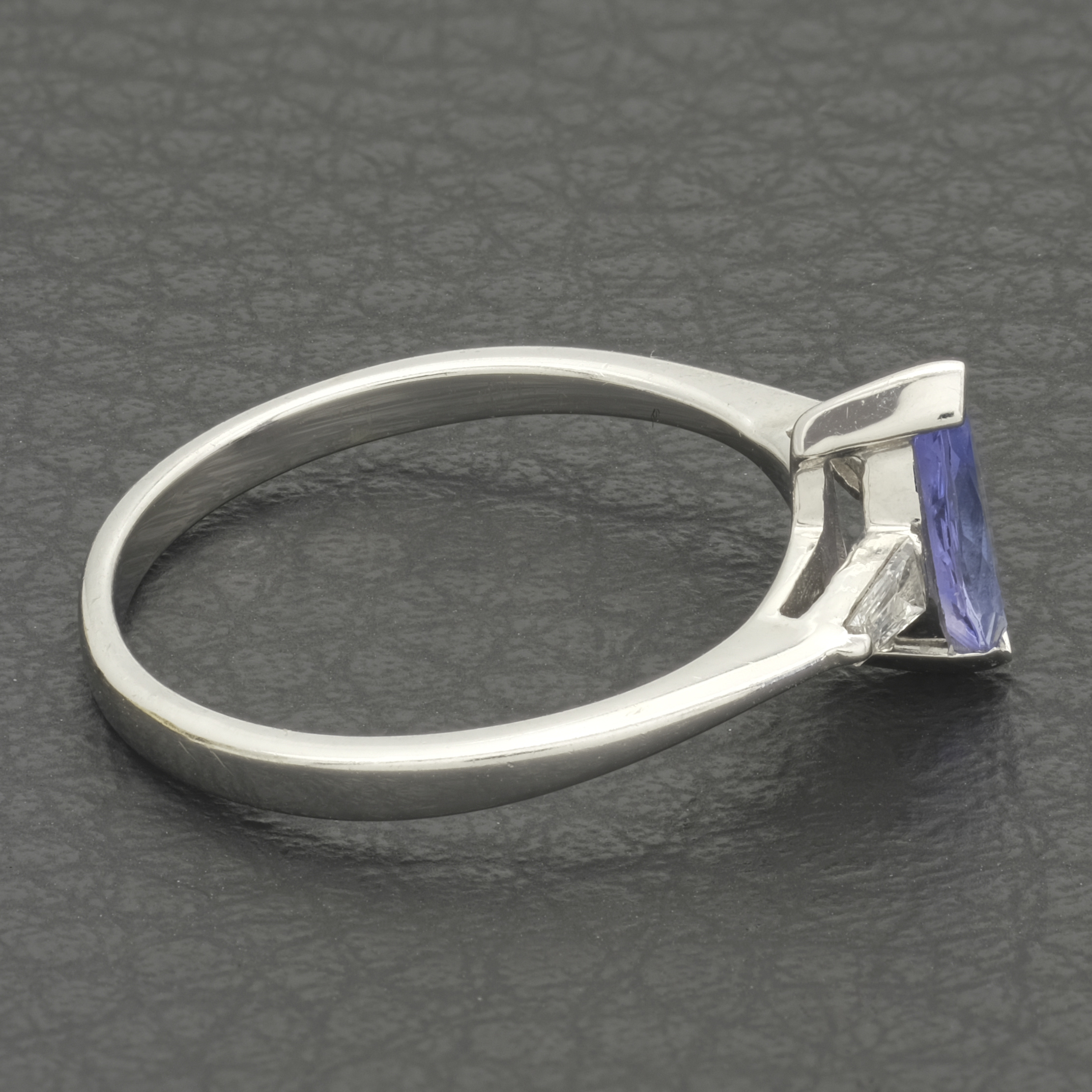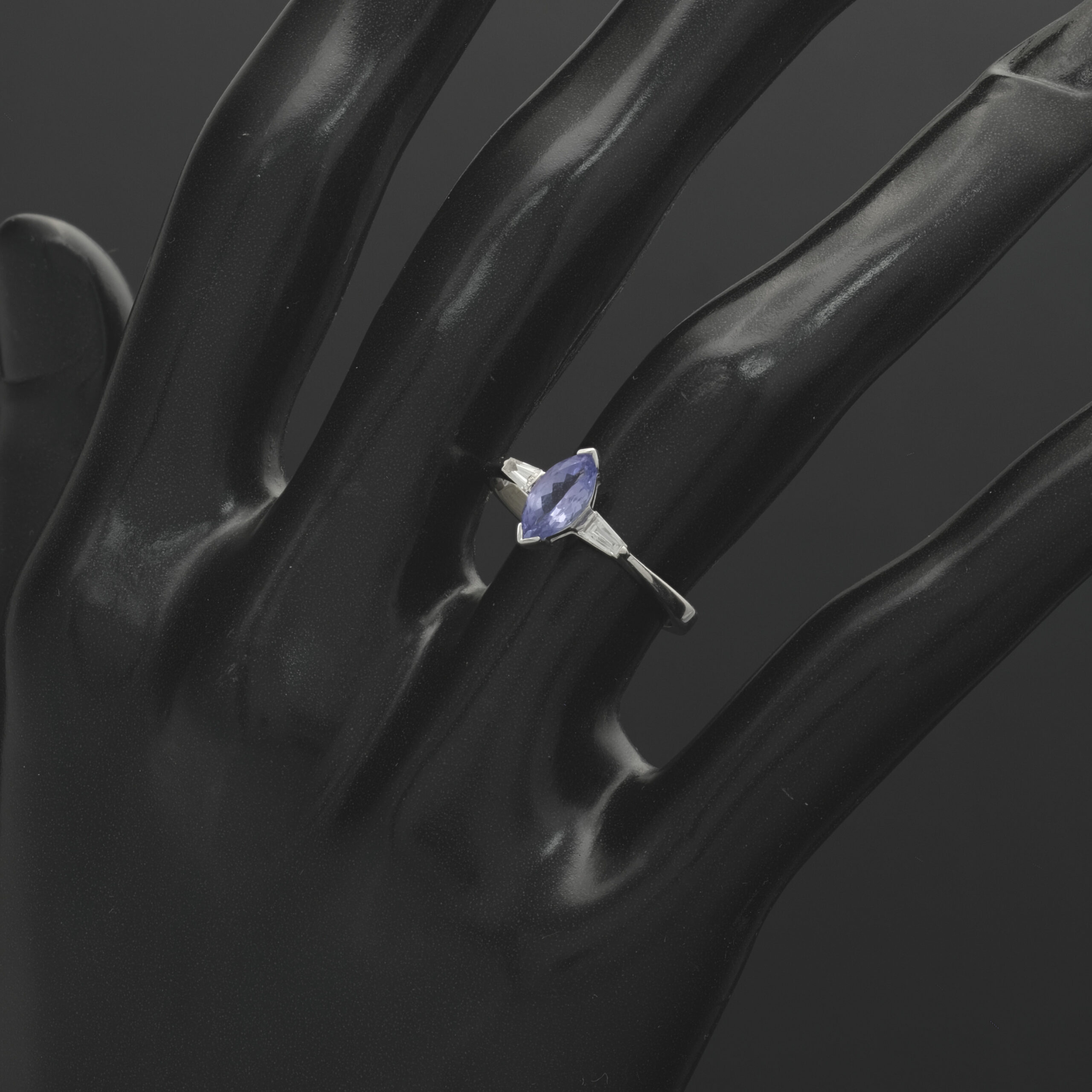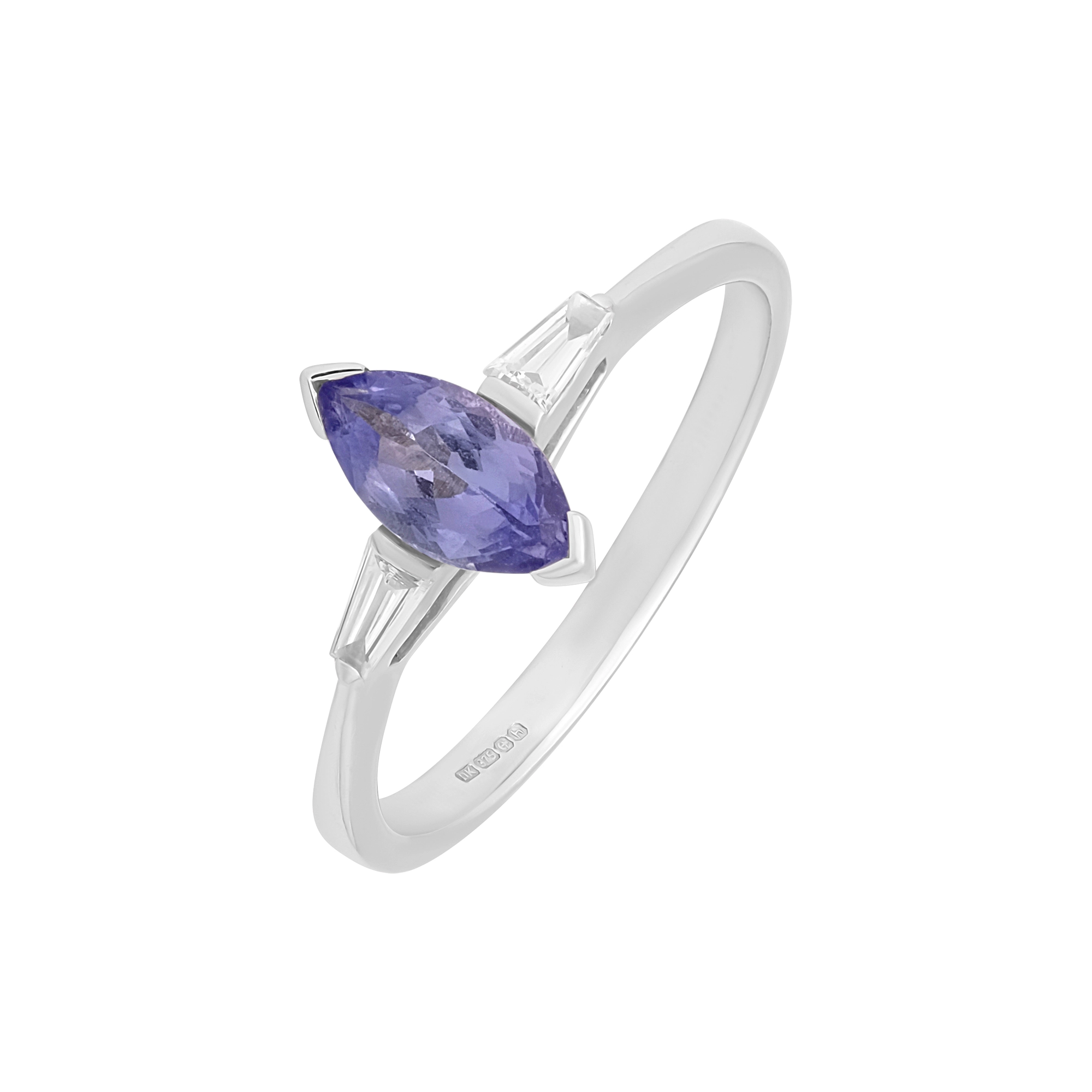 Embrace timeless beauty with this pre-owned 9ct white gold tanzanite and diamond ring. At its centre, a striking 0.50ct marquise-cut tanzanite dazzles with its vivid violet-blue hue, exuding sophistication and charm. Flanking the center piece are two sparkling diamond baguettes on each side, with a total diamond weight of 0.12ct, adding a touch of brilliance to the design. Set in sleek white gold, this ring is a perfect blend of elegance and modern style, making it a stunning choice for any special occasion or as a treasured gift.