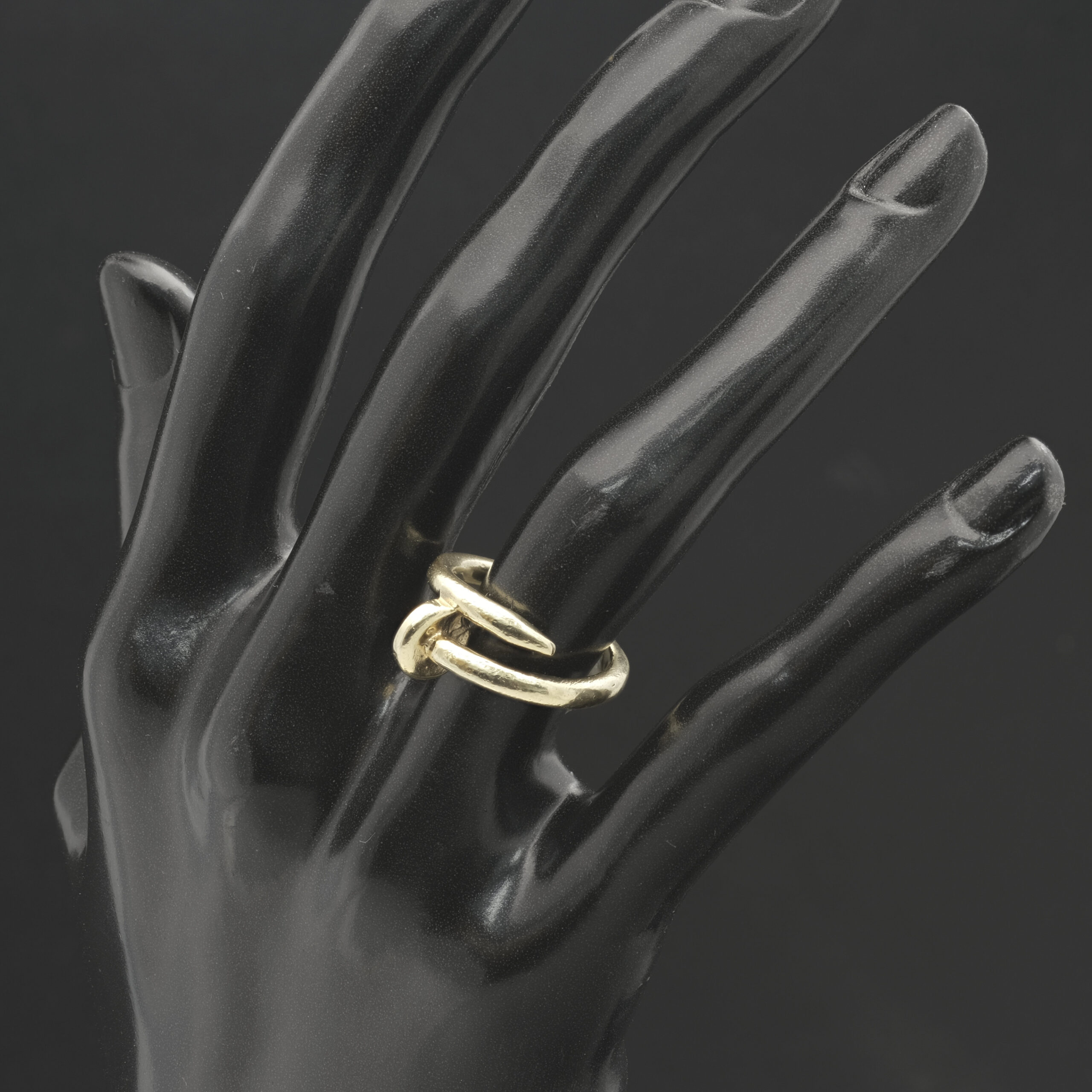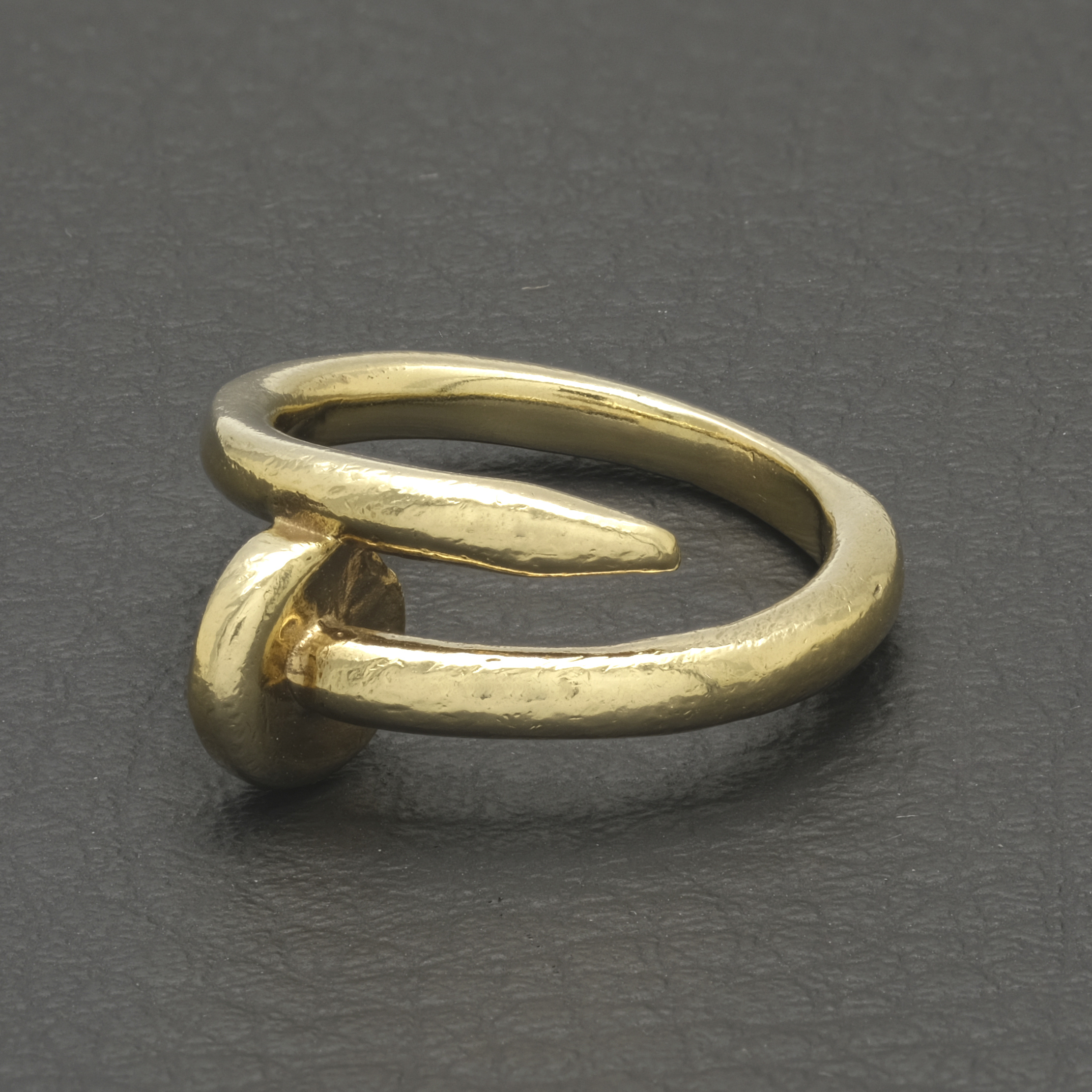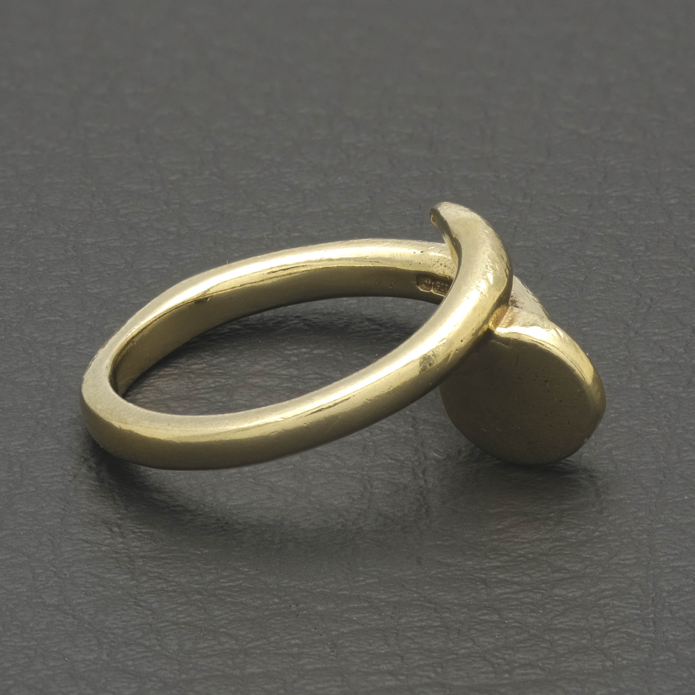 A pre-owned, solid 9ct yellow gold ring that will stand the test of time. A nail ring is a unique and contemporary piece of jewellery that combines simplicity with an industrial edge. Crafted to resemble a bent nail, this accessory often symbolises strength and resilience, blending everyday objects with high-fashion aesthetics.